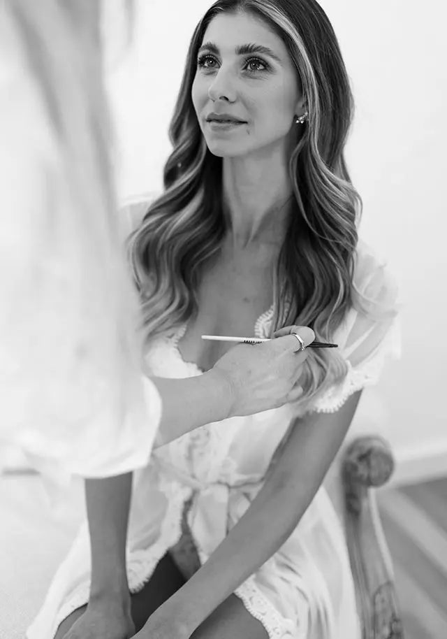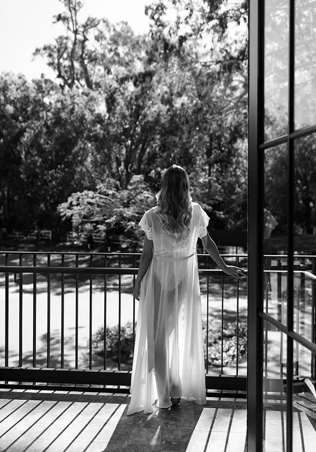 Style note: To get ready the bride wore our Ingrid Bodysuit in white and romantic Farrah Long Lace Chiffon Robe. Lori's bridesmaids wore matching Homebodii Jasmine Robes in blush satin.