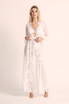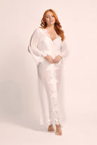Our best-selling Helena Lace Robe embodies timeless elegance and modern romance. Crafted from semi-sheer white chiffon and adorned with intricate lace rosettes, this signature Homebodii design perfectly balances sophistication and allure.