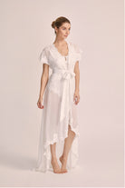 The short sleeves offer a light and breezy feel, making it ideal for warmer days or layering over your favourite sleepwear. Whether you're getting ready for a special occasion, enjoying a relaxing morning, or embracing a quiet evening, the **Valentina Robe** envelops you in luxury and style.