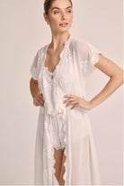 Elevate your loungewear with the Homebodii Valentina Robe, a perfect blend of timeless elegance and modern sophistication. Crafted from luxurious chiffon, this robe drapes effortlessly over the body, creating a flowy and graceful silhouette. The intricate lace detailing along the neckline and sleeves adds a delicate, feminine touch, while the robe’s high-low hemline brings a contemporary twist to its classic design.