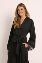 Exquisite lace detailing adorns the sleeves and hem, adding a touch of romance and refinement. With a flowing silhouette and a self-tie waist, this robe offers both comfort and a flattering fit, making it perfect for slow mornings, relaxing evenings, or layering over your favorite Homebodii pieces.