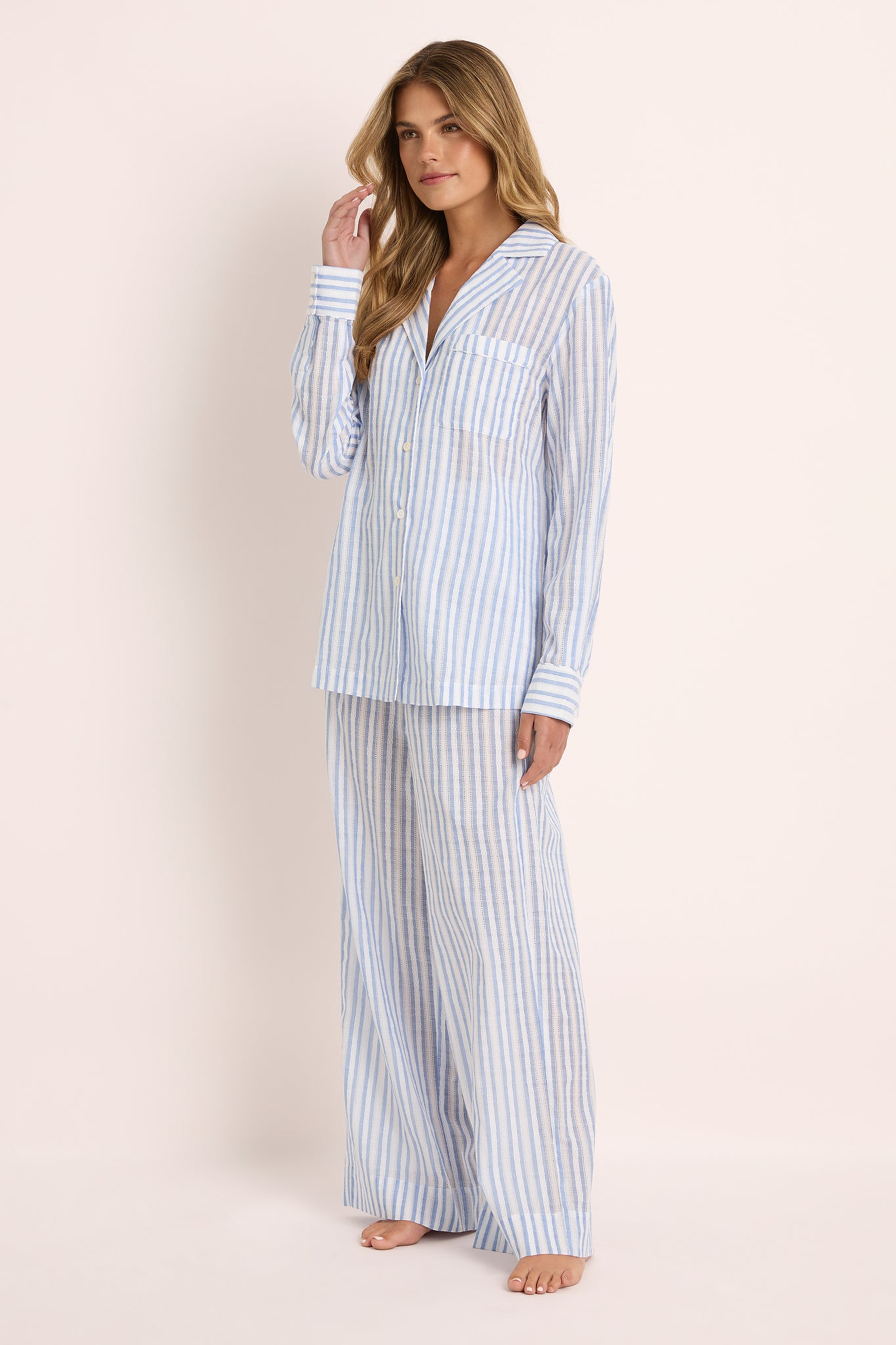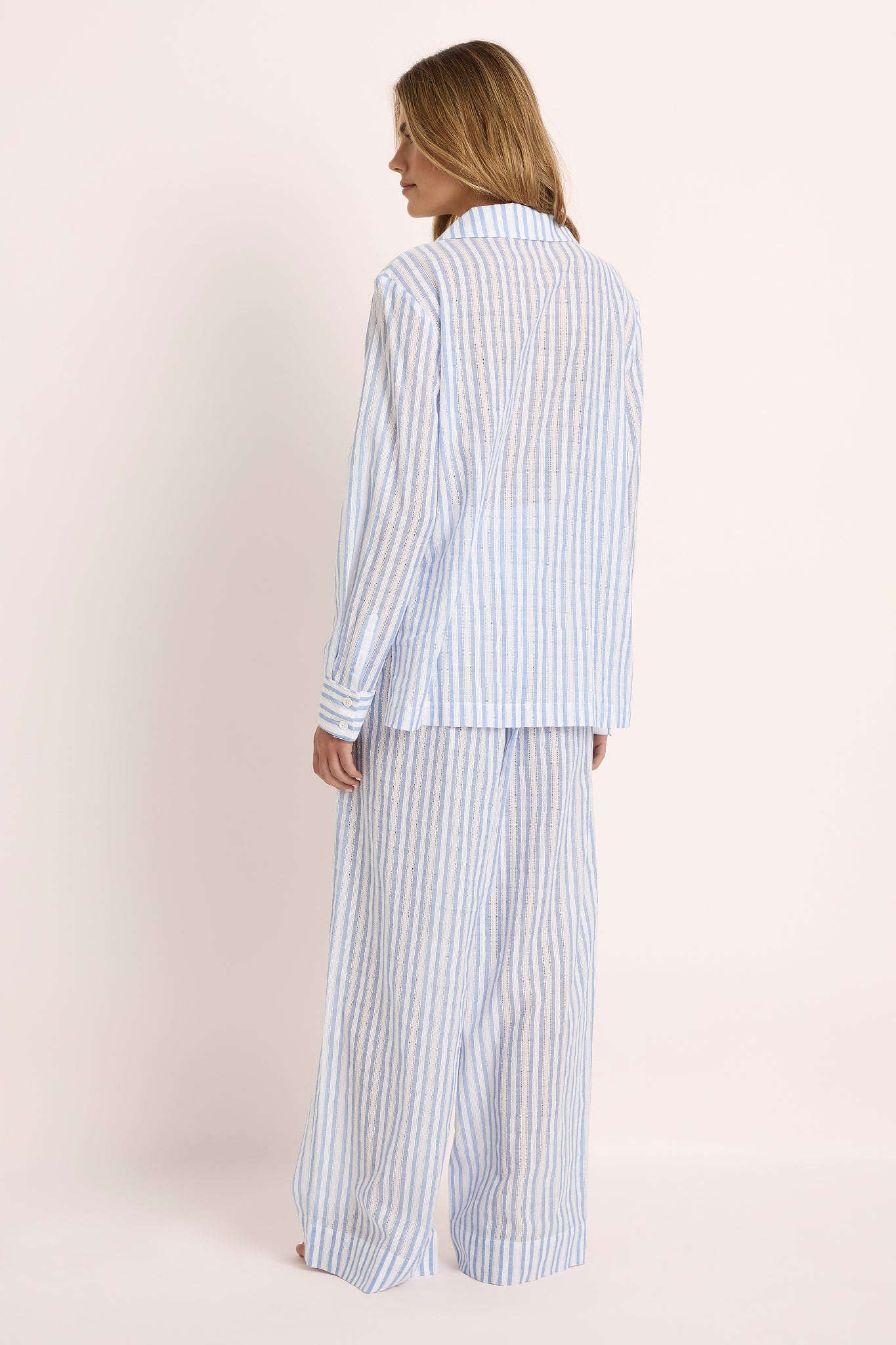 The classic button-up shirt drapes naturally over the body, complemented by wide-leg lounge pants that offer ease of movement and timeless elegance. Designed in a refreshing blue-and-white stripe, the Vienna brings an air of coastal serenity to everyday wear — perfect for slow mornings, travel, or laid-back afternoons in the sun.