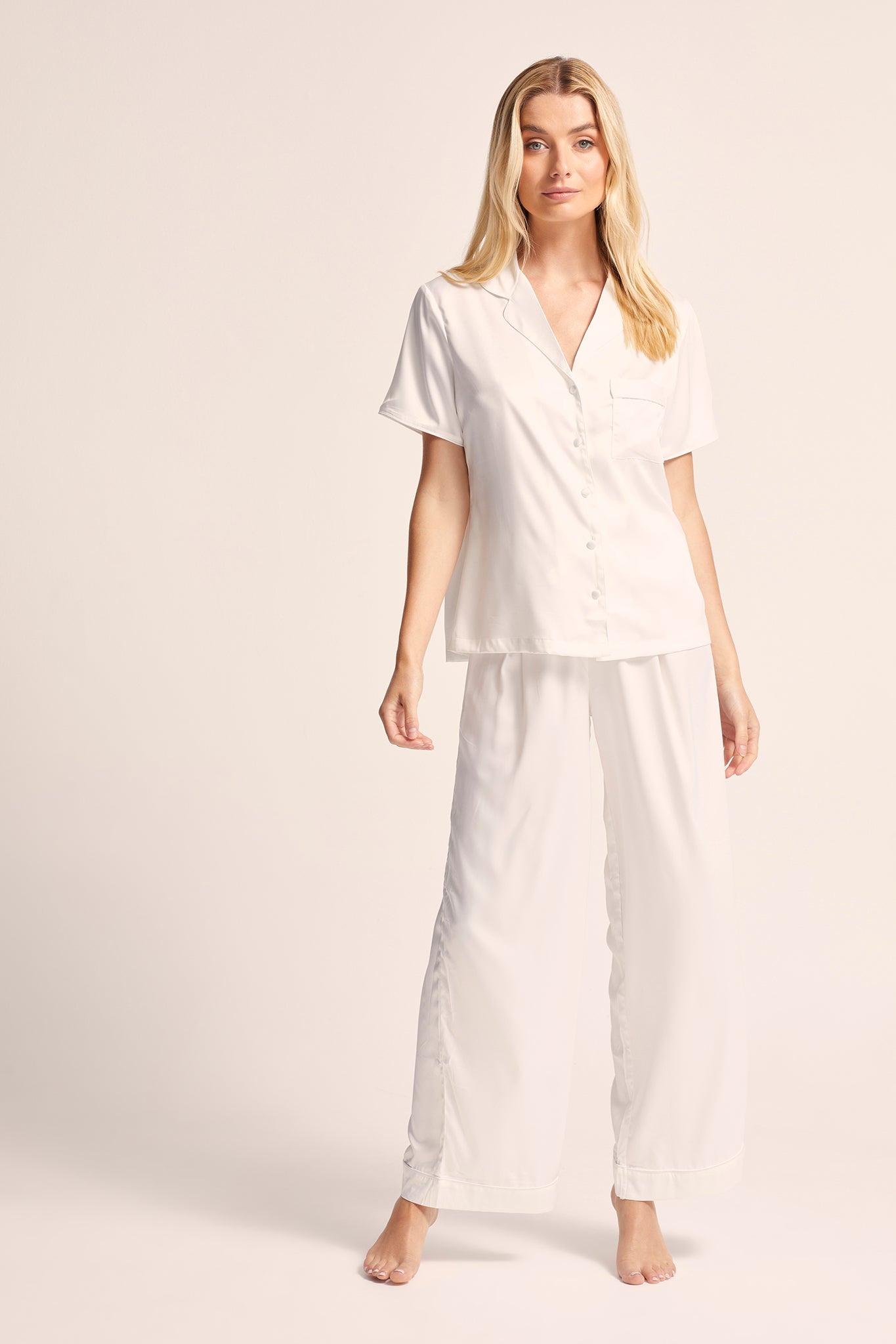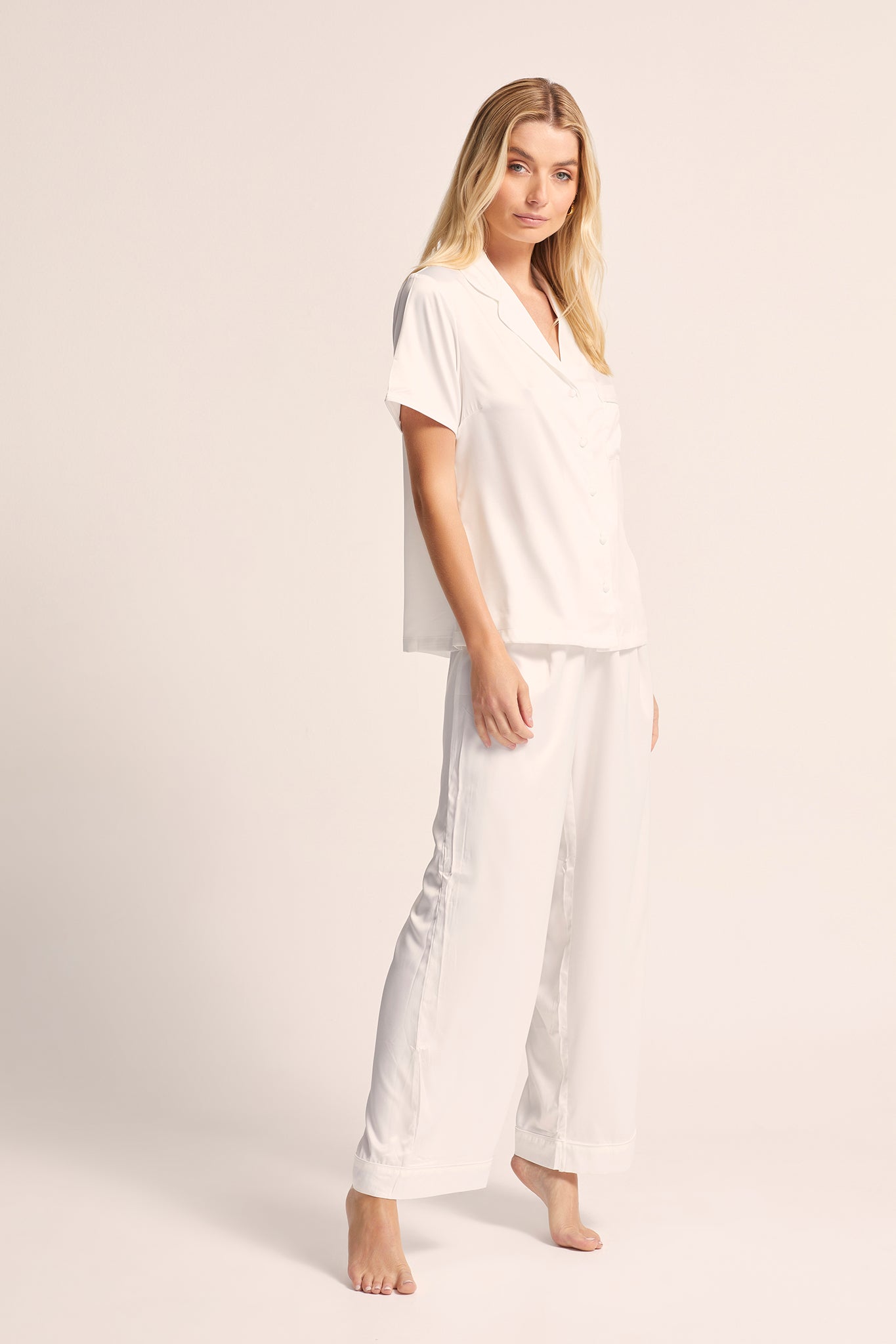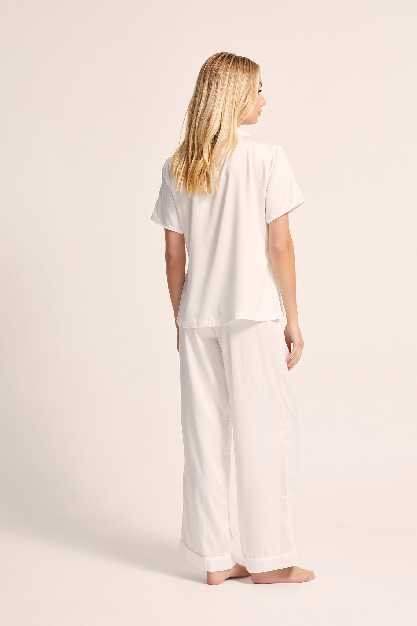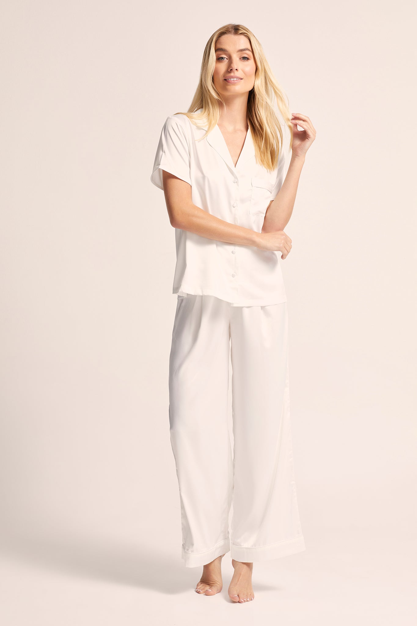 Lounge Pyjama: Perfect for those who value both style and comfort, the Toni lounge pyjama set features elegant self-colour piping and a relaxed fit. The adjustable waistband guarantees the perfect fit, making it ideal for cozy nights at home or lounging in pure luxury.