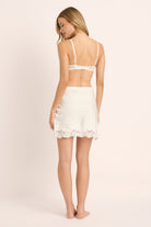 A romantic modern classic. The Celestine Lace Mini Skirt by Homebodii is crafted from lustrous white satin and finished with a delicate eyelash-lace hem. Designed to flatter and move gracefully, this piece captures the beauty of a wedding morning and the elegance of life beyond it.