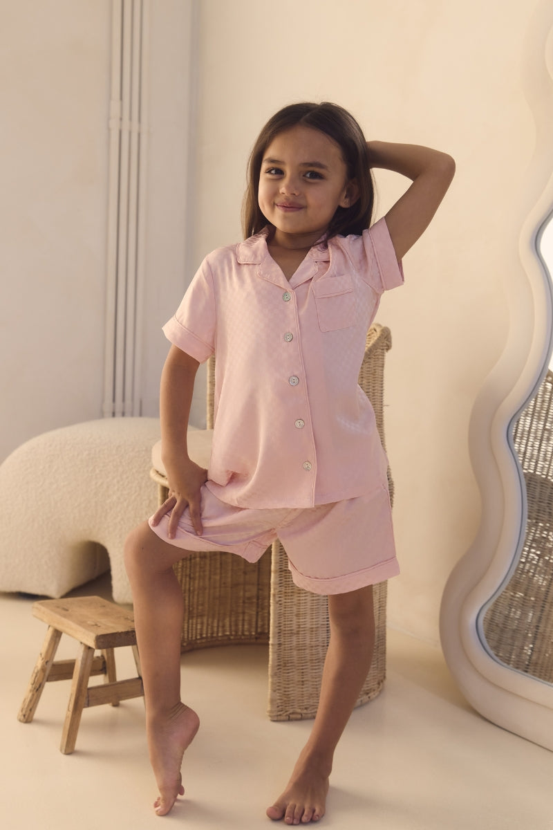 Introducing the all-new Gigi Checked Satin Kids Short Set from Homebodii – where luxury meets sustainability in the most delightful way. Designed with the same meticulous attention to detail as our women's collection, this short set lets your little ones match in style with our beloved Gigi range.