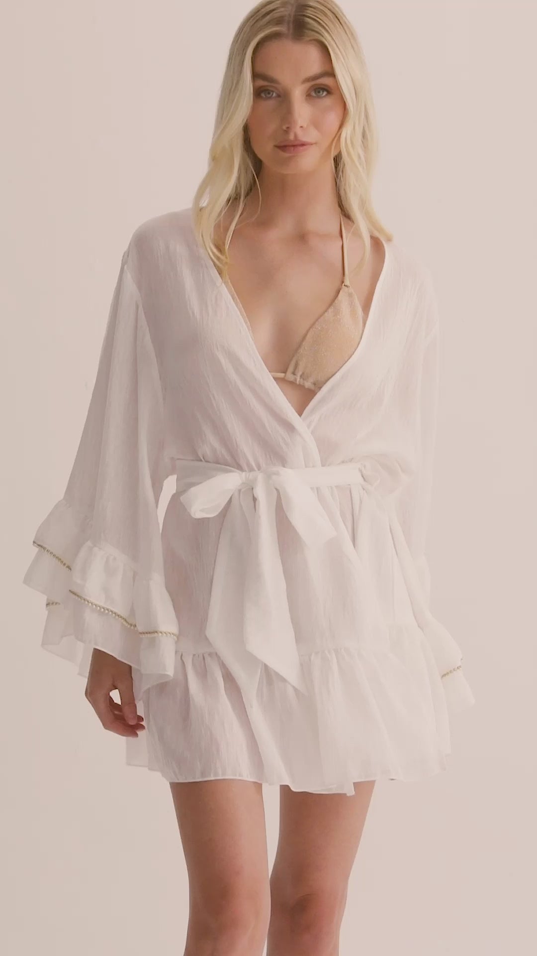 Crafted with meticulous attention to detail, the Ischia Kimono is a versatile garment that can be worn open as a chic beach cover-up or as an elegant dress for any occasion. Its relaxed and flowing silhouette adds a touch of effortless sophistication to your ensemble.