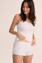 The delicate detail, adjustable straps, a graceful neckline, and softly tailored short, enhance its romantic appeal, while the fresh white hue embodies purity and sophistication. Whether worn for lounging, sleep, or as an elevated base layer beneath your favorite robe, this set captures the essence of Homebodii’s signature softness and refined femininity.